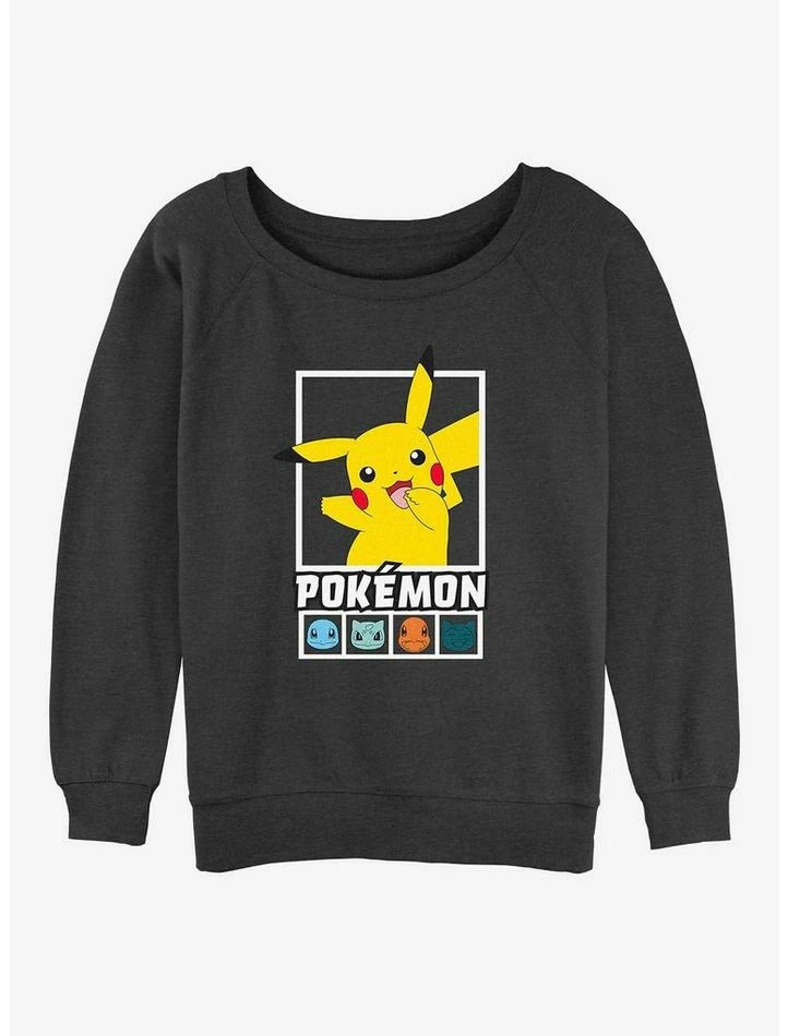 Discount ๐งจ Pokemon Battle Lineup Pikachu, Squirtle, Bulbasaur, Charmander, & Snorlax ๐ง Girls Slouchy Sweatshirt ๐